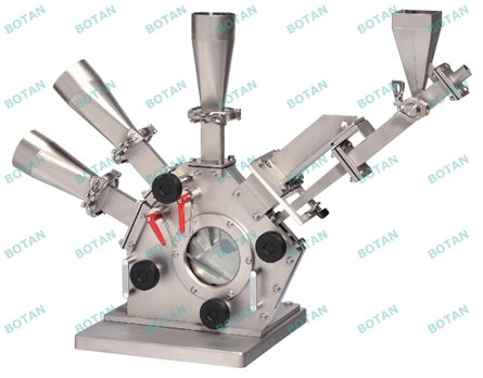 依據(jù)上述原則,對(duì)粉體的分散采用高速的引射噴嘴將粉 料引射入分級(jí)機(jī)中,利用高速氣流對(duì)粉體的剪切作用,使粉體分散成原級(jí)顆粒。此外為使分級(jí)后的超細(xì)粉達(dá)到較高的分級(jí)精度,采用射流附壁效應(yīng)與離心力、慣性力、多級(jí)分選組合的途徑。